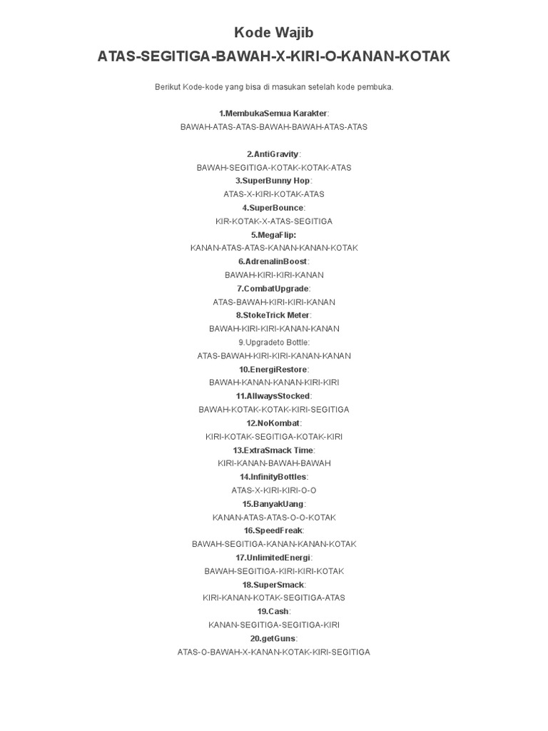 Untuk melihat kode downhill dominasi sangat gampang kamu bisa menerapkan lebih lanjut kode tersebut dengan gampang dalam permainan downhill dominationdi sini kamu akan temukan semua kode yang sangat unik dalam permainan tersebutkamu bisa mendapatkan semua karakter yang kamu inginkan. Di bawah ini adalah kumpulan kode downhill ps2 lengkap bahasa indonesia meliputi kombinasi tombol kode dan efek cheat yang ditimbulkan. Masukan kode di bawah ini saat sedang bermain.