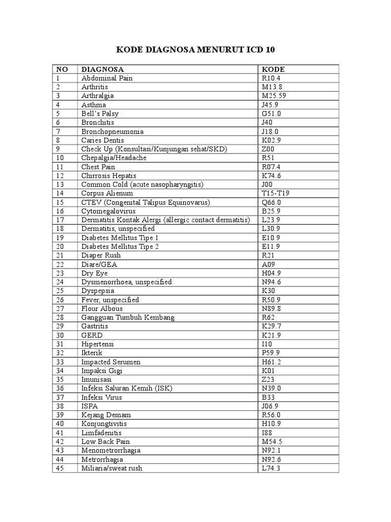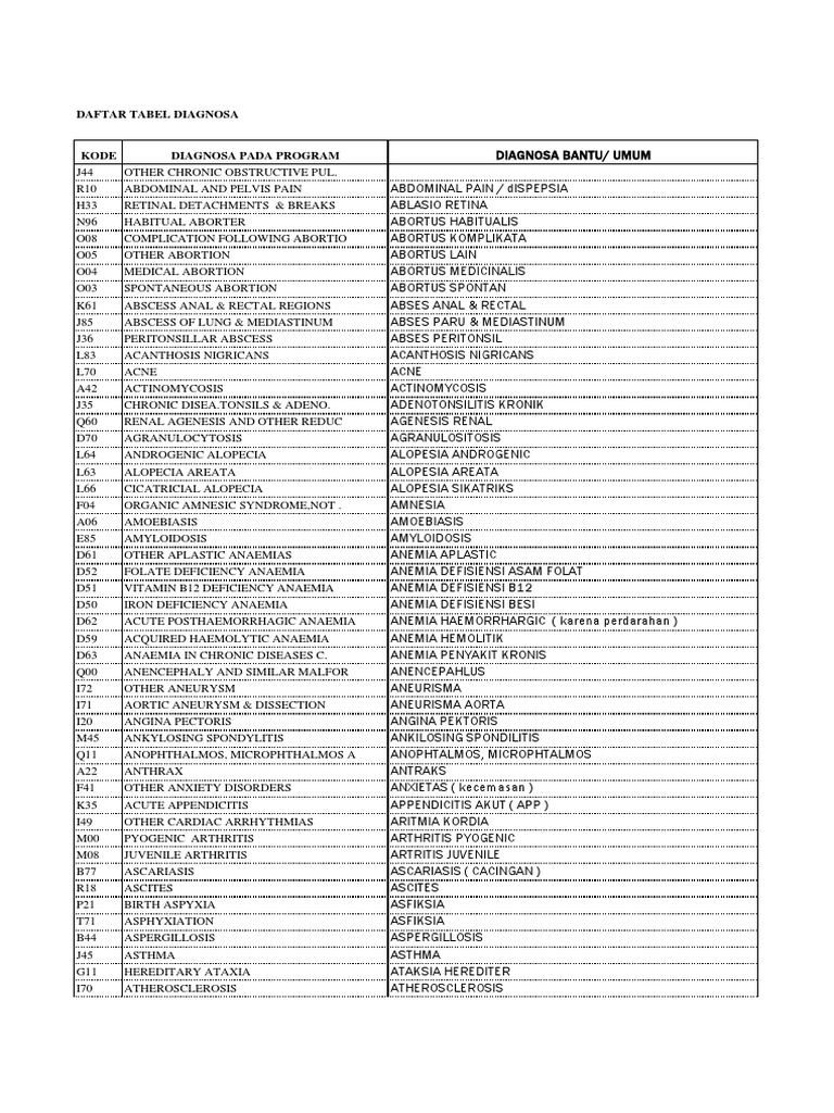 90 diagnosa utama noicd diare akut a09 diplopiapandangan ganda h532 dislipidemia e78 dislokasi s 03 dislokasi temporo mandibular joint s030 dislokasi sendi s 07 disloksi pergelangan kaki s 93 disorder of cornea h18 disorder of inner ear h83 dispepsia k30 dispnoe r 06. Diagnosa icd x per poli. Kode icd x ab iminens o200 ab.